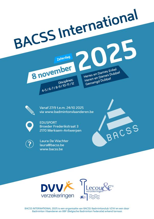 Het is weer zover, op zaterdag 8 november organiseren we ons jaarlijks toernooi! Ook dit jaar gaan we weer internationaal met BACSS International 2025. We spelen enkel, dubbel en gemengd dubbel voor de klassementen 4-12. Kies je 2 favoriete disciplines en schrijf je snel in! Zoals steeds wordt er weer voor heerlijke catering gezorgd tussen al het spelplezier door of voor bij de nabespreking.